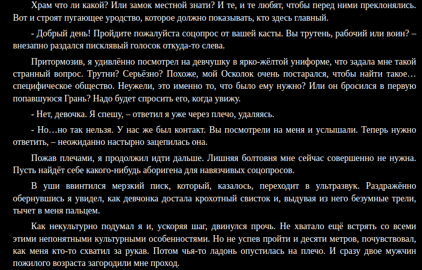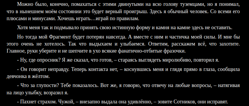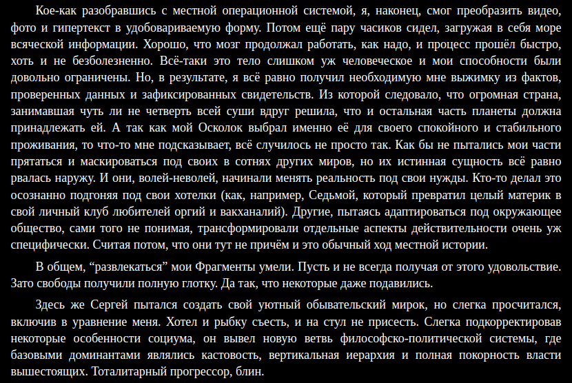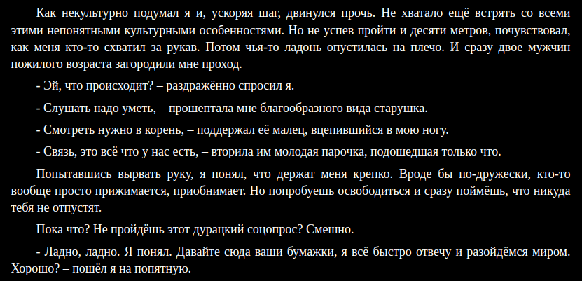 1. Написано хорошим языком. Чувствуется авторский стиль, узнаваемая манера. Это не первая книга Сергея Елиса, которую я читаю, уже узнаю его характер, который реально есть. Напрочь отсутствуют позорные стилистические косяки в духа повторения. На Автор-Тудей, очень часто можно обнаружить у разных писателей повторение одного и того же слова. Например, на одном коротеньком абзаце встречается одно слово 4 раза. Это недопустимая стилистическая ошибка. Интересно то, что когда автору указываешь на это, он(она) обижается. У Сергея я ничего такого не обнаружил. Текст очень приятный, за все время чтения мне ни разу не захотелось материться и задушить автора, а это важный индикатор.
