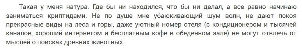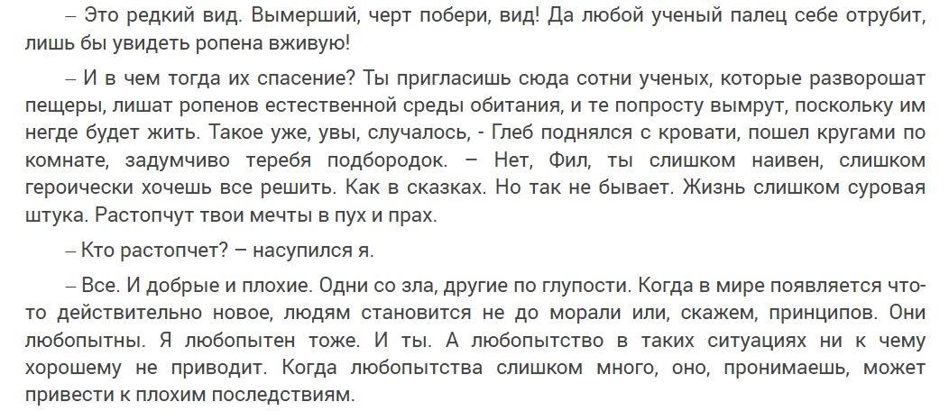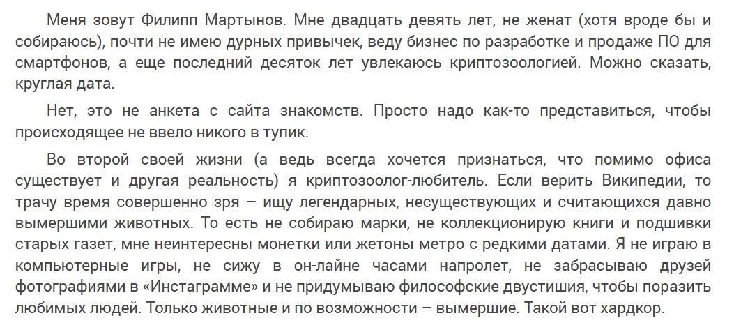 Сюжет постепенно раскачивается, читателю дают возможность вспомнить все, что было ранее, и влиться в новую книгу. Насладиться с героями умиротворением, полюбоваться природой и начать строить планы по поискам нового редкого животного.