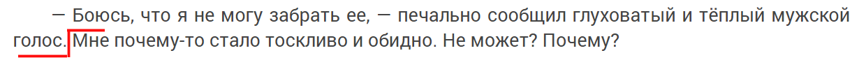 – Не знаю. Насколько понимаю, вставляла из ворда служебные символы. Меня больше удивляет, почему она не отделяет абзацем прямую речь от последующей, тем более если отрывки относятся к разным персонажам.
