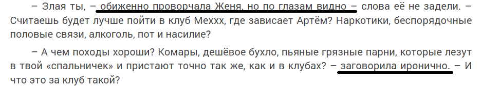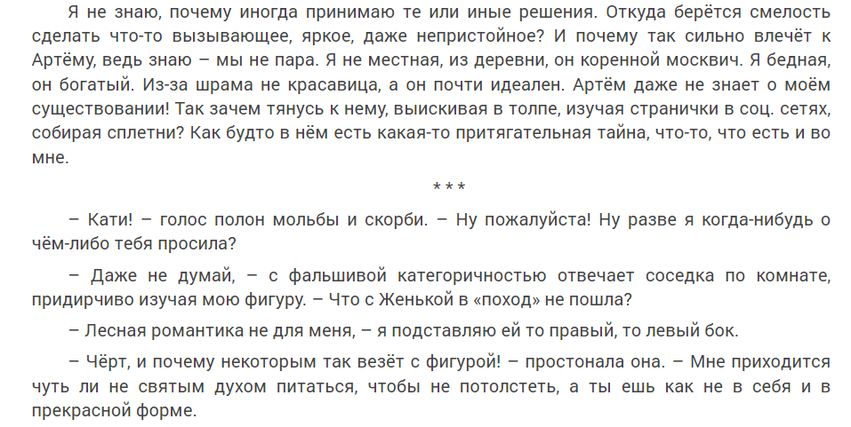 Так же не всегда оправдано скачет время. Вообще, в повествовании от первого лица перемена времени не является ошибкой, так как идёт поток мыслей героини, а они могут быть разными. Но так как у нас всё-таки художественное произведение, время — это приём, которым можно пользоваться грамотно. Например, быстрые сцены можно писать в настоящем времени, когда необходимо полное погружение и действие происходит здесь и сейчас. А если действия закончились, и героиня пересказывает события или прокручивает в голове, время может быть прошедшим. Здесь не всегда перемена времени является приёмом, возникает ощущение, что автор хочет писать в настоящем времени, но сбивается и пишет в прошедшем.