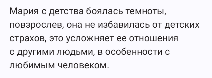 Итак, жила-была девочка Маша. С детства её учили видеть в людях только хорошее, доброе и светлое. Повзрослев, Мария поняла, что мир не делится на добро и зло, ведь в каждом человеке вполне себе мирно уживается и то, и другое. Девушка не была готова к таким сложностям и предпочла одиночество, по сути, замкнувшись в себе. А тут ещё и детские страхи... Мария всегда боялась засыпать в полной темноте. Ребёнком она даже просила маму оставлять свет в коридоре и та тонкая полоска света, которая проникала сквозь приоткрытую дверь в комнату, её немного успокаивала. Уже будучи взрослой, оставшись в полном одиночестве (мама к тому времени умерла), девушка не смогла перебороть свой страх. Она до поздней ночи смотрела телевизор, борясь со сном, пока усталость не брала своё и девушка забывалась тревожным сном... Жизнь не стоит на месте. Мария знакомится с достойным парнем, который через некоторое время переезжает к ней, причём именно по просьбе девушки. Мария рассказывает Максиму о своих детских страхах, чем и убеждает молодого человека в необходимости жить вместе.