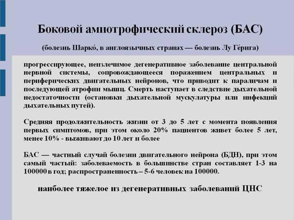 БАС,быстропрогрессирующий. Нейро-дегенеративные это страшно, чем больше общество об этом знает, тем больше шансов все таки, что лекарства будут создаваться и будет шанс на выздоровление у людей, до слез, честно говоря, тронуло местами, просто до сих пор глаза на мокром месте. Рак лечат, вич лечат, болезни, которыми болеет много людей, их больше изучают, это страшная лотерея, но чем более редкое заболевание, чем меньше оно на слуху, тем меньше его изучают. Тем меньше шансов на выздоровление. Человек вообще до сих пор неизведанный космос, как ни странно. Но нужно верить в силу духа всегда, Хокинг тому пример. Спасибо, что авторы затронули такую важную тему.