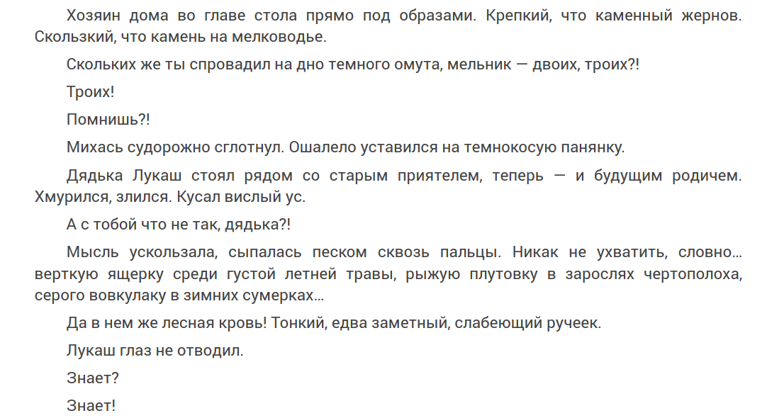 И вот это мне понравилось особенно: воля, управляющая природными процессами, отделена от самих процессов. Когда в книге говорится «лес сделал то-то» или «река повела себя так-то», это не лес, не река как таковые — это воля тех, кто является лесом и рекой. Эта разница важна, иначе можно начать искать в тексте то, чего там нет и быть не может. Никаких «природа добра/зла», «человек — непослушный сын матери-природы» и прочих глупостей новейшего времени. Такие представления никогда не были глубинными — это всё из сочинений на тему «Как я бездарно провёл двенадцать лет в школе».
