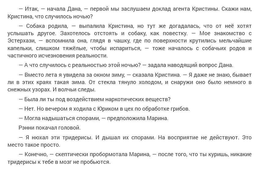 С одной стороны найти цитату не так сложно, в тексте огромное количество «заявлений» по многим аспектам жизни, которые могут послужить наполнением любого цитатничка. Но копирование закрыто. А так же не очень хочется тырить спойлеры (памятуя особую нежность местной публики к чисто сюжетным перипитиям) плюс фактически все реплики глубоко вшиты в ткань рассказа (как говорится «даже хомяк в норе не пёрнет просто так»)... Посему я так побегала туда-сюда по тексту и выхватила не особо знаменательный кусок. Который тем не менее некоторое представление о стилистике покажет.