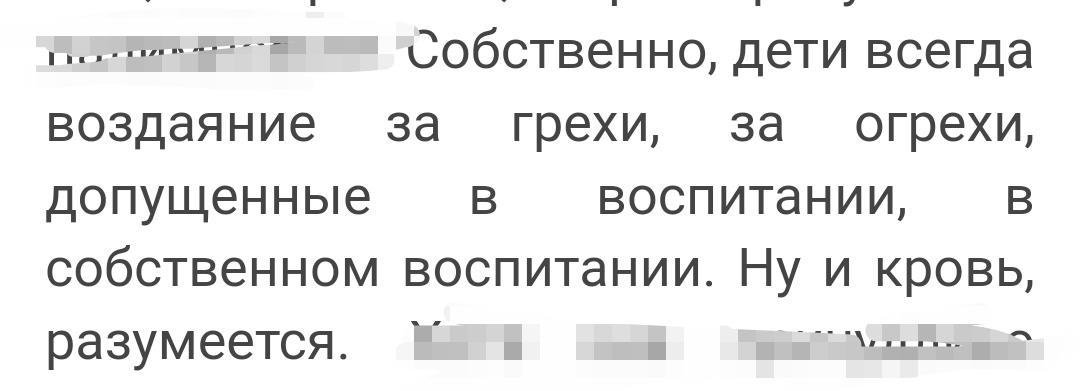 Итак, забота о близких, о детях — неотъемлемая часть Человечности. Но родительская любовь ещё более слепая, чем та, что между мужчиной и женщиной. Родительская любовь и воспитание — ещё не гарантия тому, что из ребёнка вырастет Человек. Но чем больше ребёнка щекочешь (образ будет понятнее после прочтения книги), чем больше его любишь, вкладываешься в него эмоционально — тем больше шансов, что при любом раскладе человеческое в нём будет живо.