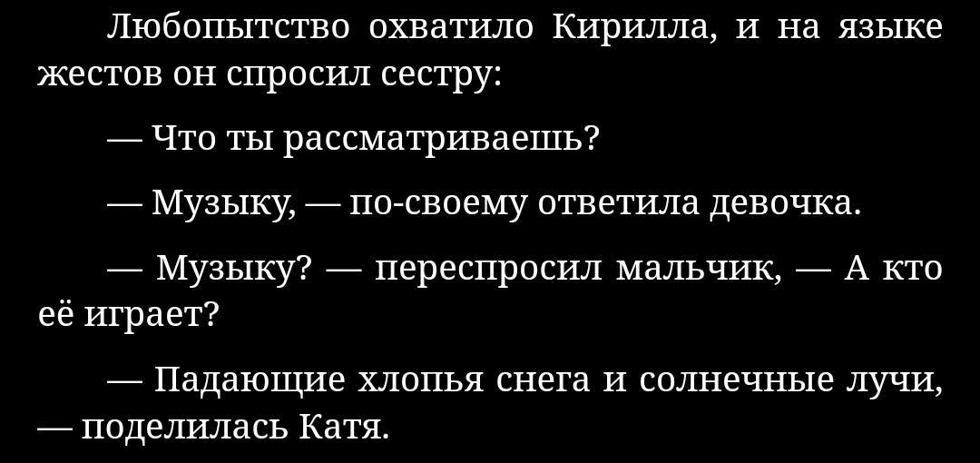 Не так часто в литературе встречаются персонажи с недугами, тем более с такой разновидностью тугоухости. Автор осознанно открывает проблему, и то как в благополучных Кирсановы умеют превращать беду в фактор объединения, а общение жестами делает их отношение друг к другу не доступным для остальных. Атмосфера в их доме, как остров счастья.