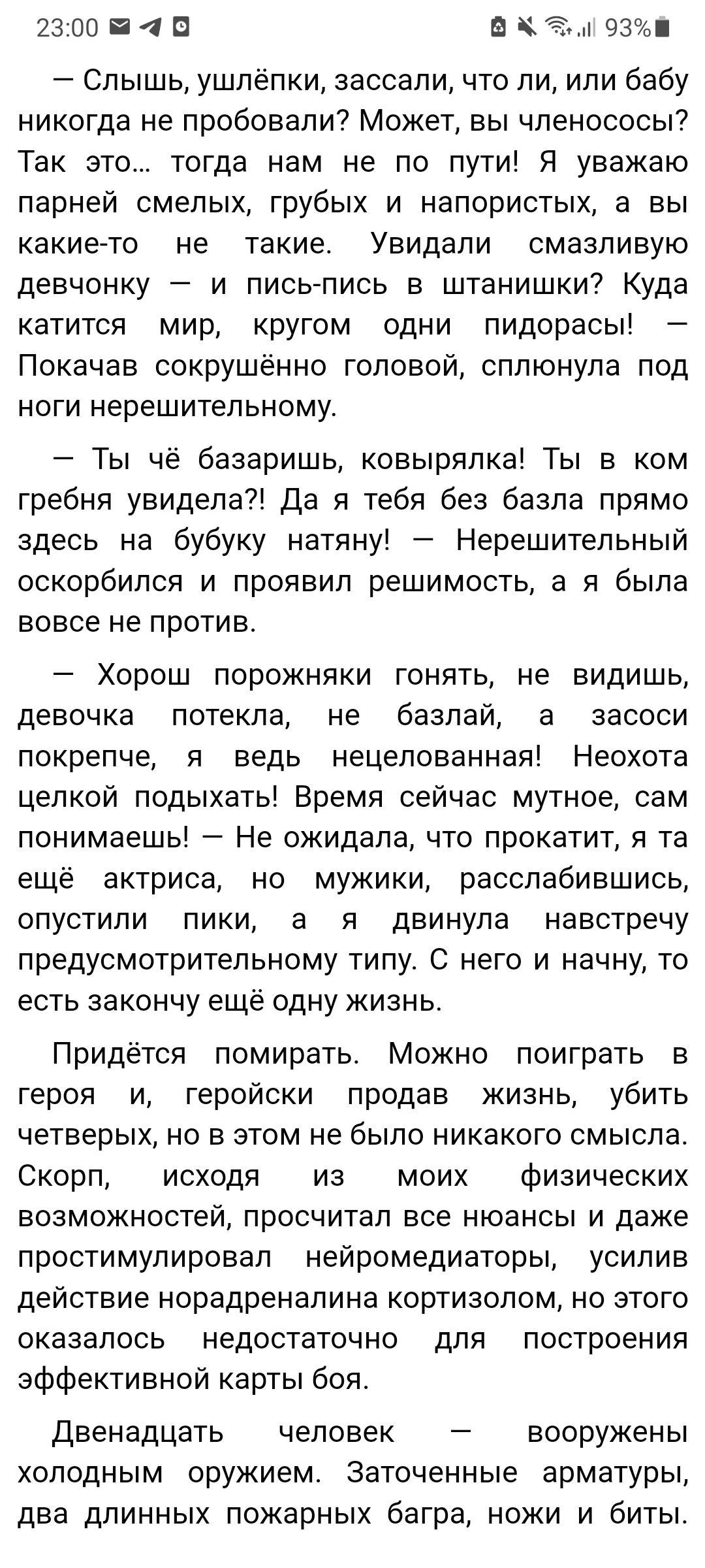 Впрочем, на проблему обсценной лексики обратили внимание ещё до меня. Автор оправдывает это тем, что он, так-то, заранее предупреждал всяких неженок и вон, даже пометка стоит, мол 18+ - пиздюкам не трогать.