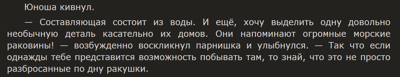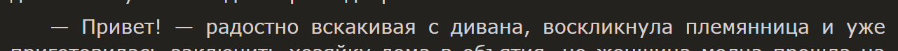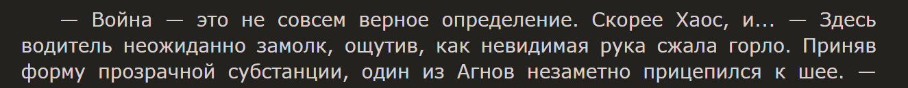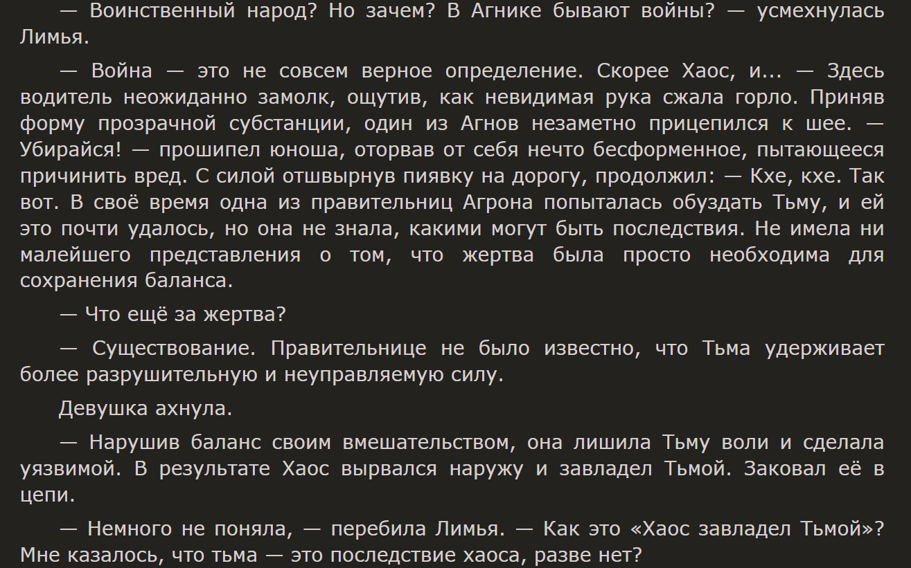 Чтобы два раза не вставать - оформление диалогов здесь очень страдает. Вот этого здесь в каждой главе по два раза, и это очень затрудняет чтение: