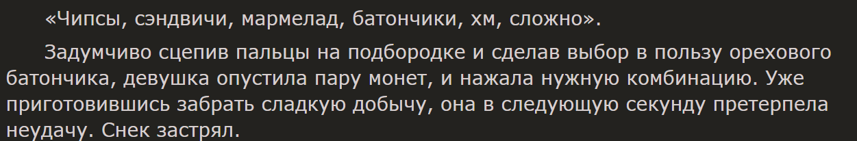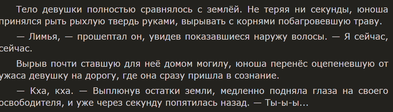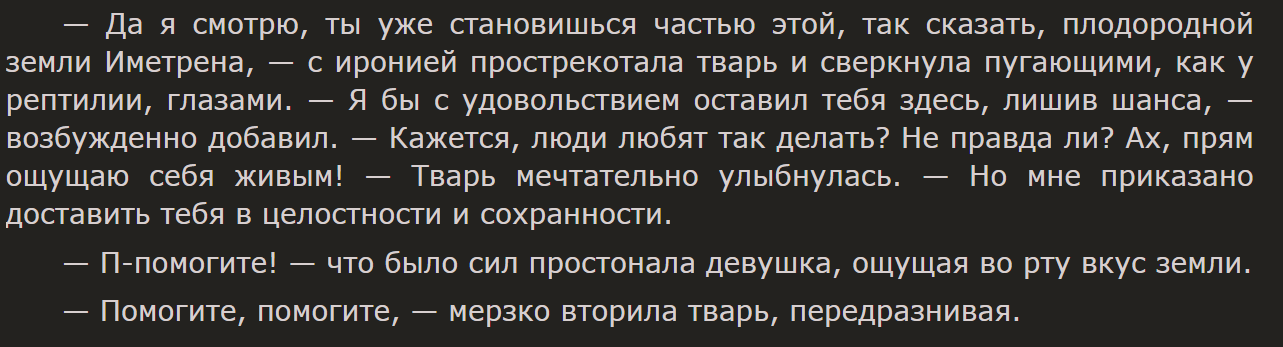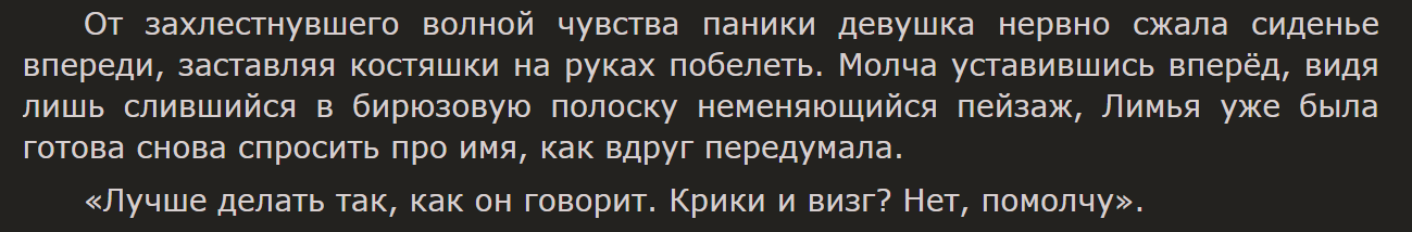 И, наконец, на уровне смысла даже в коротком абзаце собралось сразу несколько нелепостей. И самая главная - которой тоже болеет весь текст - это невероятный психологизм, взятый из подростковых анимешечек. Анимешечки - отличная тема, сама иногда смотрю, но нужно понимать, что это визуальный жанр, который работает по другим законам. В аниме уместны и не вызывают вопросов рефлексии через внутренние монологи. "Что я тут делаю? Я чувствую вот это... что мне делать?.. Если я сделаю так - случится это, если так - случится то, а если я это ему скажу - он ответит это и тогда получится вот так... нет, лучше я сделаю вот это" - это прием, который в аниме органичен. В книги не надо это тащить, пожалуйста. Внутренний монолог живого человека так не выглядит. Живой человек, который, как Лимья, жил спокойно нормальную жизнь, а потом вдруг оказался в окружении сенобитов, а спустя полчаса обнаружил себя в машине с каким-то левым парнем, который непонятно куда едет и несет какую-то дичь, не будет думать "орать мне или не орать". Он либо будет орать, либо не будет. Он может в лучшем случае подумать "а что изменится, если я начну орать?".