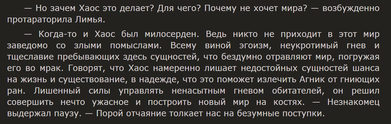 Почему Хаос не хочет мира - это прекрасный вопрос. Экзистенциальный, если задуматься, но лучше не задумываться. А еще когда-то Хаос был милосерден, но потом всему хорошему как обычно помешало все плохое. Но так как у нас тут темное фентези, то хорошее на самом деле плохое, а плохое - не такое уж и плохое. Говорится об этом в лоб.