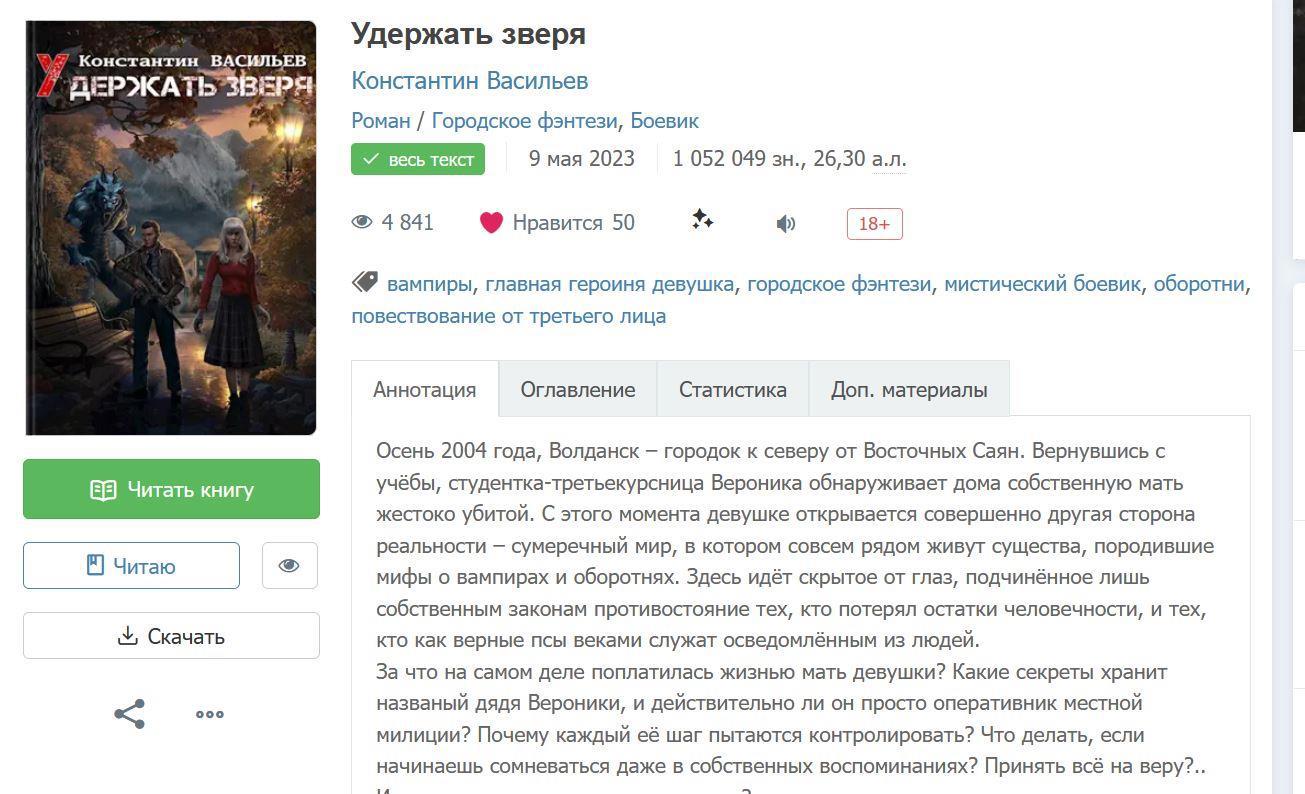 Вообще меня порадовал, да. Ошибок особо нет, кровь из глазок не течёт. Там в предыдущих рецах автору пеняли на обилие заместительных. У меня глаз тоже иногда цеплялся за это, "Белая ищеек" и "волчица ликантропов" немного бесили иногда, как по мне, лучше бы просто именами, особенно когда две белых волчицы. Ну и всяких "милиционер" и "оперативник" тоже много, если имена героев все уже знают, то оно вроде как не нужно.