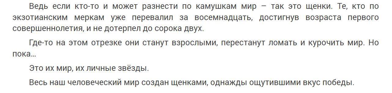 Так что книга хороша и в плане поиска смыслов, и в плане экшена. Ну и текст написан блестяще по стилю - взгляд просто летит по строкам!