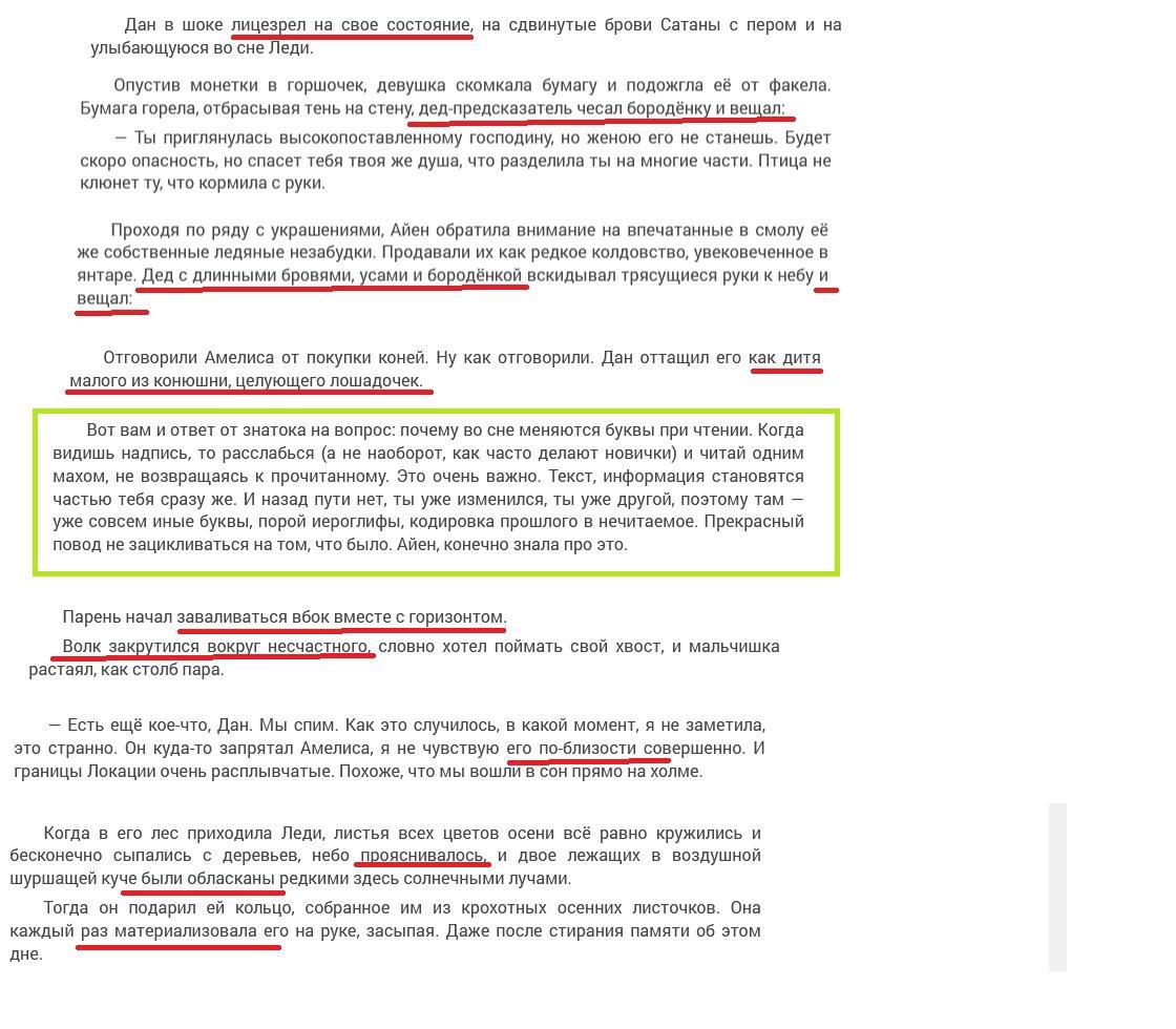 Опечатки, описки, тавтология, ошибки конструкций/словоупотребления - есть, некоторые отскриншотил, подчеркнуты красным. два последних фрагмента - из следующей книги цикла, но такие ошибки характерны для всех текстов автора (в зеленой рамочке не ошибка, а самый понравившийся мне абзац текста)