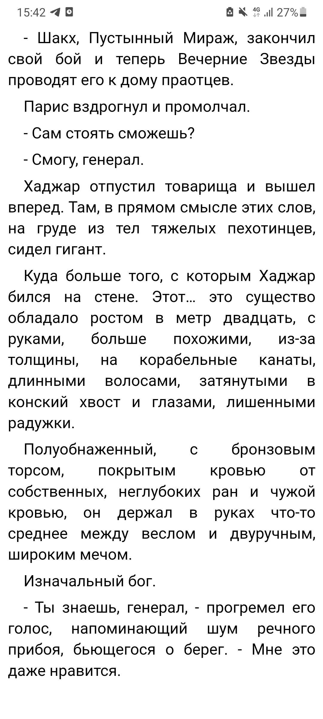 Хаджар Дархан... Борей Дархан... Чёрный Генерал... Синий Генерал... Ветер Северных Долин... был... есть... будет... никогда не был... Короче, наш ГГ, кем бы он там не был, одолевает главгада в лице Реки Мира не магией, и даже не мечом, как таковым. Он одолевает его собственной яростью и мечтой о свободе. Только вдумайтесь: Хаджар Бореевич Дархан потратил миллионы миллионов попыток, каждая из которых занимала по несколько триллионов лет, чтобы, в конце концов, заставить Тварь допустить ошибку, ослабив бдительность.