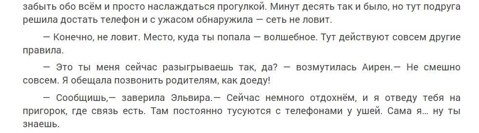 Хотелось бы больше объяснения происходящего по сюжету и не только. Информативности не хватает. Некоторые вещи в попросту не объясняются, некоторые пропускаются. В общем и целом всё здорово, но из-за недостатка информации не знаешь как воспринимать те или иные вещи. Только догадываться остаётся, но и это не так-то просто. Вот общается Эльвира со своей подругой Аирен, приехавшей из города. Городская жизнь и жизнь в глуши, полной магии, столкнулись. Эльвира говорит, тут конечно же сеть не ловит - это место волшебное (утверждение с позиции, что эта информация общедоступна), а Ариен отвечает "ты меня сейчас разыгрываешь?" (ответ: не принятие этой информации за правду). Думаю, если бы Эльвира знала, что Ариен не знает, то предупредила бы, фразой: сеть тут ловить не будет, так как место это не совсем обычное, волшебное. Ну, не дословно, но так по смыслу. А то получается она не знает, что подруга не знает, что место волшебное и сесть тут ловить не будет. Так кто из них не осведомлён?