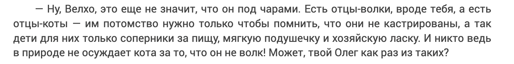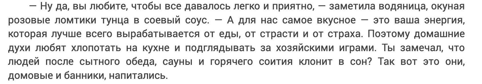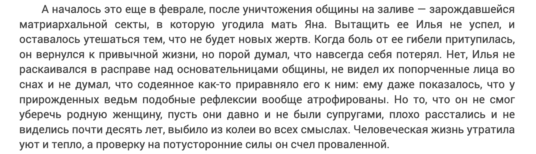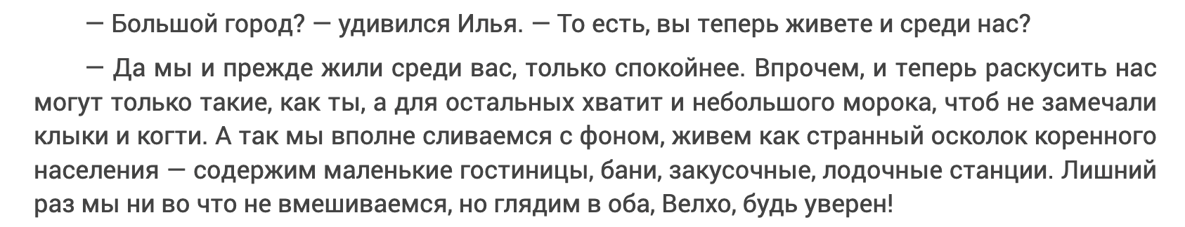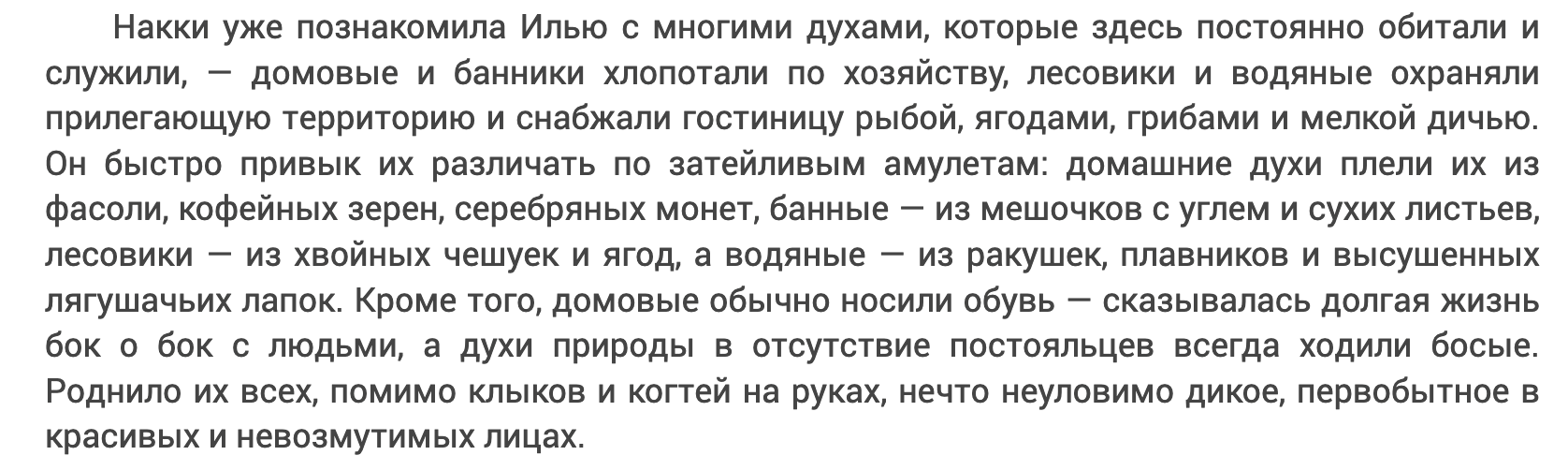 Дальше мы замечаем, что автор то ли случайно, то ли намеренно играет терминами. Для обозначения и «хороших», и «плохих» духов используются два слова: демоны и нечисть. Прочитав всю книгу, рискну предположить, что это всё-таки сделано намеренно — для подчёркивания одинаково тёмной сущности всех сторон конфликта. Просто кому-то удаётся держать «внутреннего зверя» в узде, а кто-то, наоборот, пользуется сверхспособностями на всю катушку, чтобы вредить людям и упиваться их страданиями.