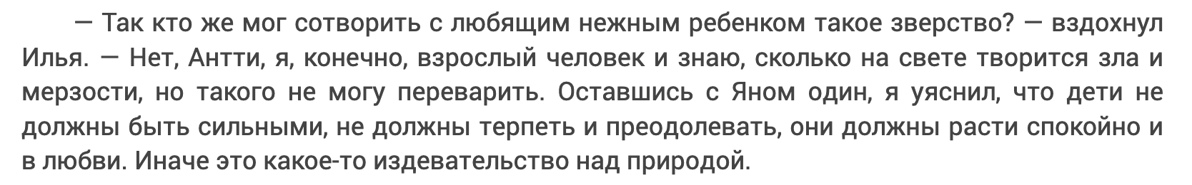 Я с трудом представляю, что взрослый мужчина может разговаривать таким языком: "любящий нежный ребёнок", "оставшись один, я уяснил, что", "дети не должны терпеть и преодолевать".