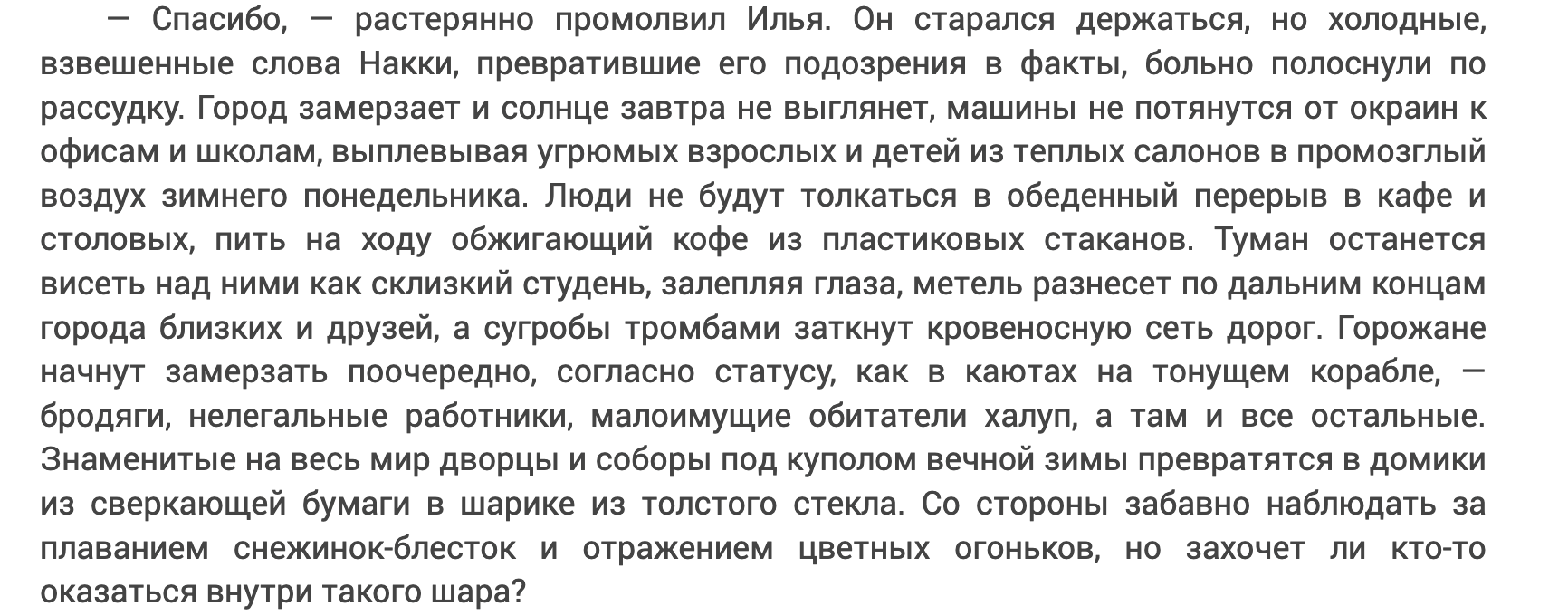 Если говорить об антураже, то Санкт-Петербург с его хмурой погодой, затяжной зимой и воспетым во многих произведениях классиков мистическим наследием очень подходит для этой истории. Мне, как петербурженке, особенно приятно было увидеть не просто абстрактные места, а вполне конкретные топонимы, которые помогают сразу понять, где происходит действие. За это автору отдельное спасибо:)
