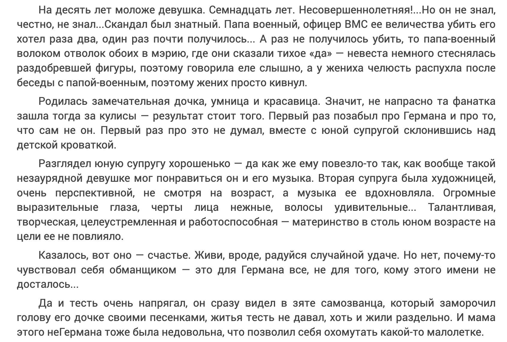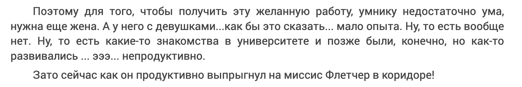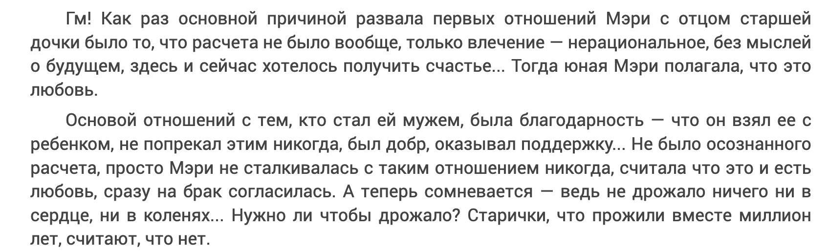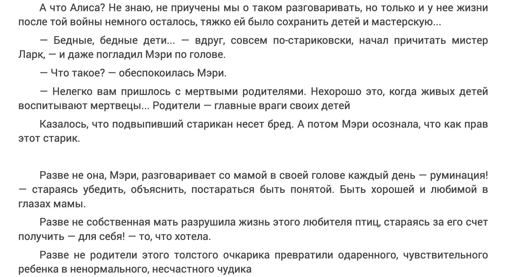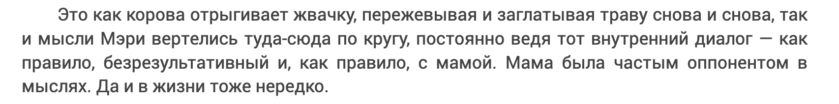 Бывает, читаю и спотыкаюсь на фразах. Скриншот за скриншотом делаю, чтобы позже проиллюстрировать замечания в рецензии. А тут проглотила всё почти за один присест и только в конце спохватилась, что надо бы какие-то отрывки сохранить в качестве образца (для себя, в первую очередь).