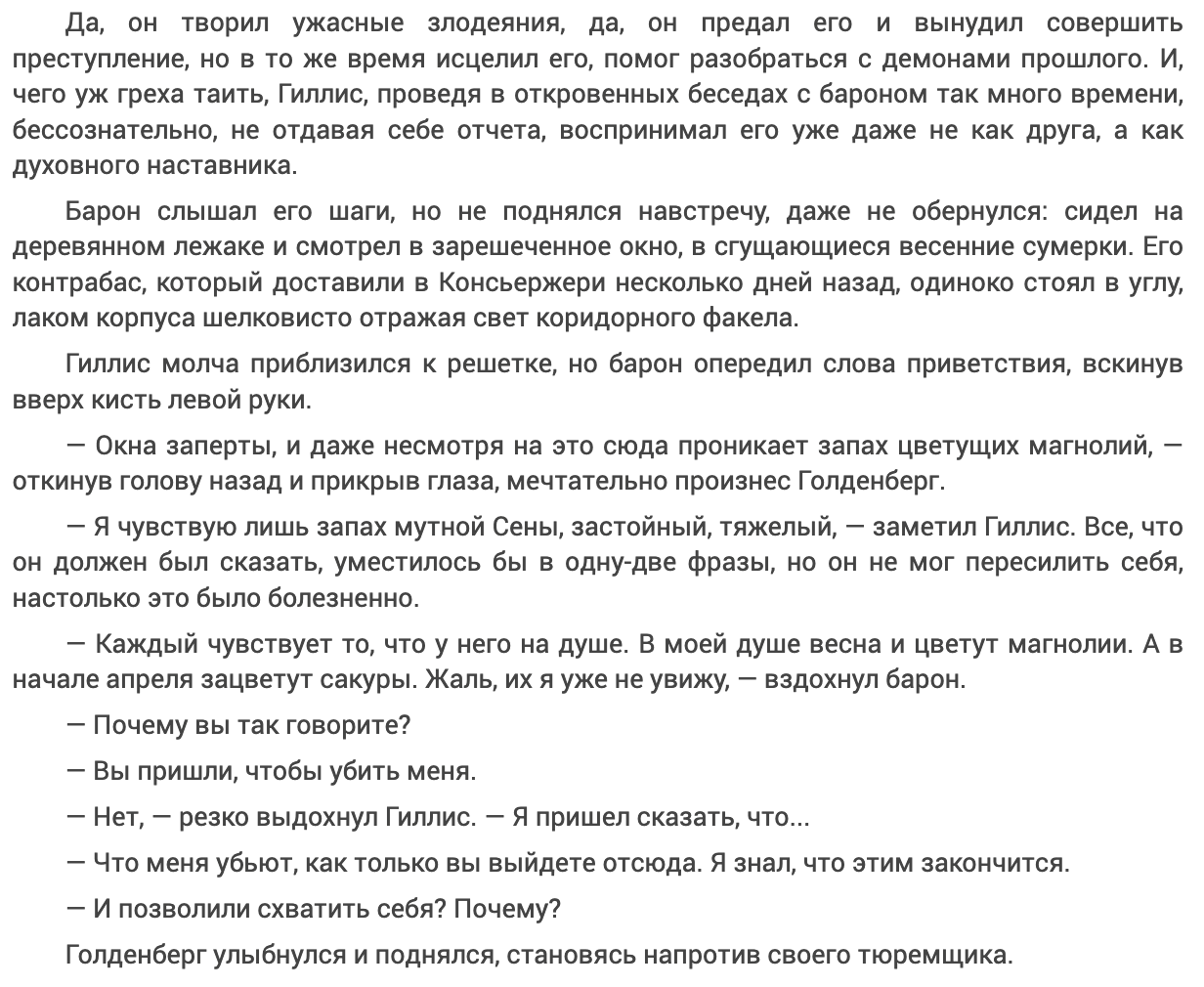 Остальные, на мой взгляд, до звания "адвоката" не дотягивают, ни сам адвокат из книги, ни "русский шпион", ни судья, ни Камилла, ни семейка Боланье... У всех душа чернее ночи, но их развитие практически не показано, в отличие от Гиллиса. То есть существует некое зло по принципу "я дерусь потому что дерусь". Даже растление Анаэль хоть и видится сущей мерзостью (особенно если учесть, зачем оно было), не показывает по-настоящему душу её хозяина. А суть Гиллиса очень хорошо передаёт фрагмент, где он сам признаётся, что барон при всей своей загадочности и темноте души стал его духовным наставником. Ну и насладитесь ещё раз чудесным языком!