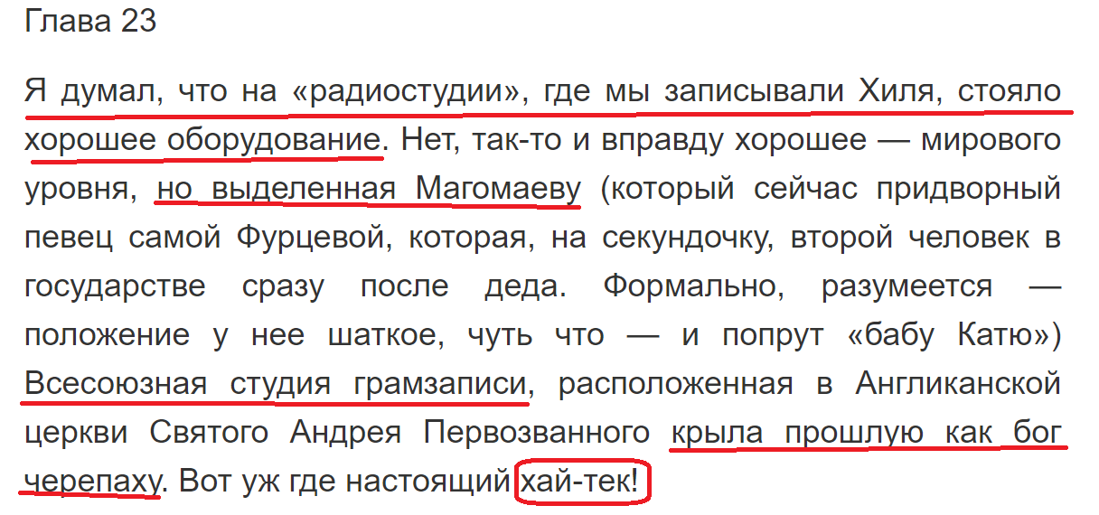 И вот использование выражения «хай-тек» в данном случае не очень уместно, потому что у большинства читателей оно вызывает ассоциации с архитектурным стилем, дизайном, но никак не с очень современным звукозаписывающим оборудованием, «высокими технологиями», что имел в виду автор.
