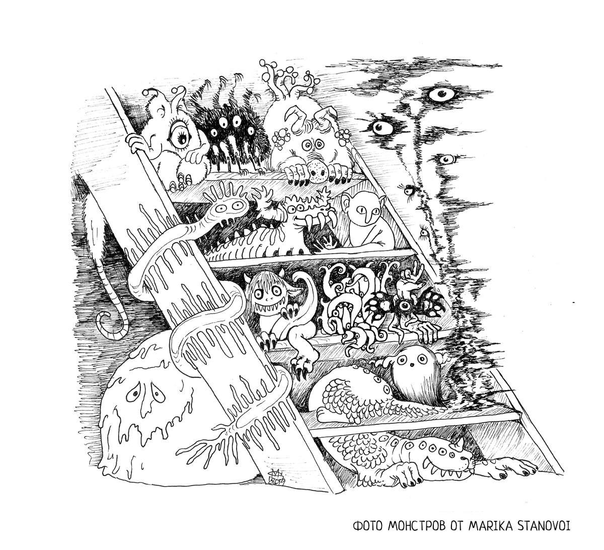 Итак, в темном-претемном подвале на старой лестнице жили монстры. Ну как жили... Плохо жили: в подвале пауки, дверь в подвал заперта, так что им приходилось ютиться на тесных ступеньках - по одной ступеньке на монстра. По-хорошему, на хозяев подвала следовало бы натравить MonstraPeace, но такого в природе не существует и пришлось натравить Макса, благо он вовремя приехал в Амбертон на пмж. Нет, ну куда-то же нужно было девать неуемную энергию десятилетнего мальчика!