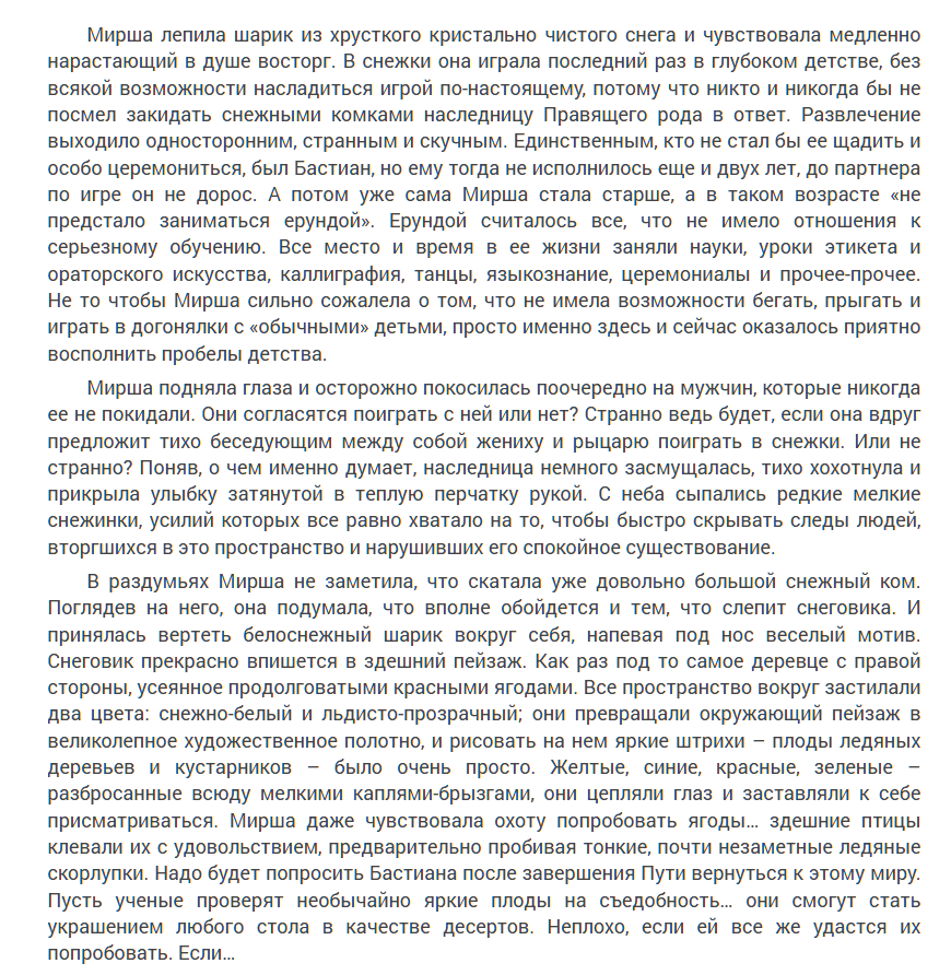 Сам по себе слог неплох. Его немного утяжеляет обилие притяжательных местоимений. «Мой», «твой» и «свой» шагают здесь за ручку длинным строем. Но не это является главной проблемой текста, а то, что я уже упоминал в подпункте о динамике. Потребность автора разжевать буквально каждое действие, каждую мысль всех персонажей. Чтобы до читателя 100% дошло, почему герой сделал именно то, что сделал. Почему подумал именно то, что подумал. И почему он вообще это сказал, а не то, другое!