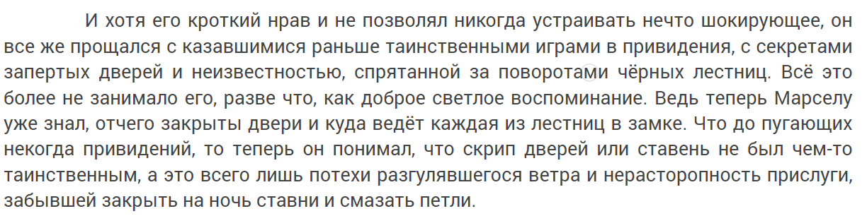 Язык изложения насыщенный, но не усложненный. Мне, в целом, очень нравилось, как автор работает со слогом и описаниями. Ну, например, вот мироощущение Марселу в его первой «личной» главе: