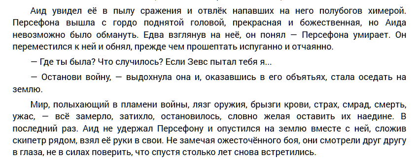 Аид — пожалуй, самый харизматичный персонаж всей книги. Конкуренцию ему смогут составить лишь Гермес и Дионис, но эти двое берут своей светлой аурой, подвешенным языком и шуточками, а вот Владыка мертвых — совсем наоборот. Его холодность чувствуется даже сквозь текст. Холодность и могущество. Способность испепелить одним лишь взглядом. Но за этим фасадом скрывается другой Аид, совсем не похожий на себя внешнего. Ведь не могла же Персефона полюбить жестокую и бесчувственную статую? Правда же? Но и здесь найдутся свои скелеты в шкафу.