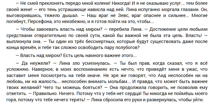 Лина/Персефона — она была не готова к такому повороту событий. Не готова, что в ней возродится дочь Деметры. И тем интереснее наблюдать за трансформацией героини из запуганной и хрупкой девушки в царицу Теней. Медленное принятие новой роли, освоение и взлет. Путь, не лишенный препятствий и смертельных опасностей. Ведь среди богов никогда не бывает спокойных времен. Путь, полный любви и драмы, страха, ненависти и прощения. Под грузом судьбы нетрудно сломаться, даже если ты — могущественная Персефона. Справится ли она с новой ролью? Прочтете и узнаете.