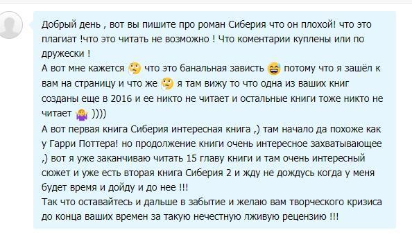 Так вот, фанат счастлив до небес, что ему посчастливилось читать сей шедевр. И пусть да, начало как у Гарри Поттера, но дальше там интересно (логично делаем вывод, что Гарри Поттер - это фигня неинтересная). Он читает уже 15 главу, и там прямо здорово. И он в нетерпении, как будет читать вторую книгу. Он полез ко мне в профиль. Увидел, там книжку 2016 года, и хоть он не заметил, что это не книга, а всего лишь мелкий рассказ, помещённый для тестирования странички, он прямо сразу понял, что "она" (рассказ) никому не нужна, никто её не читает, и потому я просто дико завидую его успешному успеху. Потому он мне желает безвестности и полного творческого кризиса за такую лживую рецензию.