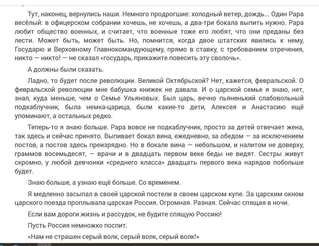 Отчасти поэтому я и веду речь о многомерности, искусно вложенной в небольшую по объему книгу. Тут и сказки, и взаимоотношения с издательством, и спасение полярной экспедиции молодым Корниловым, и пошив специальной обуви, оберегающей ноги и суставы... Много информации вложено в книгу, а вот про то, что царь истреблял ворон, сказано мельком. Чем описания последнего царя выгодно отличается от журнально-газетных статей, где авторы пышут злобой (в которой сквозит зависть). И это при том, что Щепетнев безжалостно описывает мещанство «Гессенскоймухи» - своей новой матушки. И это логично, ведь царь, несмотря на недостатки и слабую волю, был великолепно образованным человеком и в спокойное время вполне оправдывал свою должность самодержца.