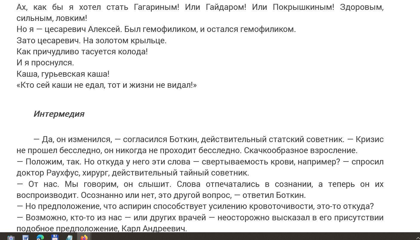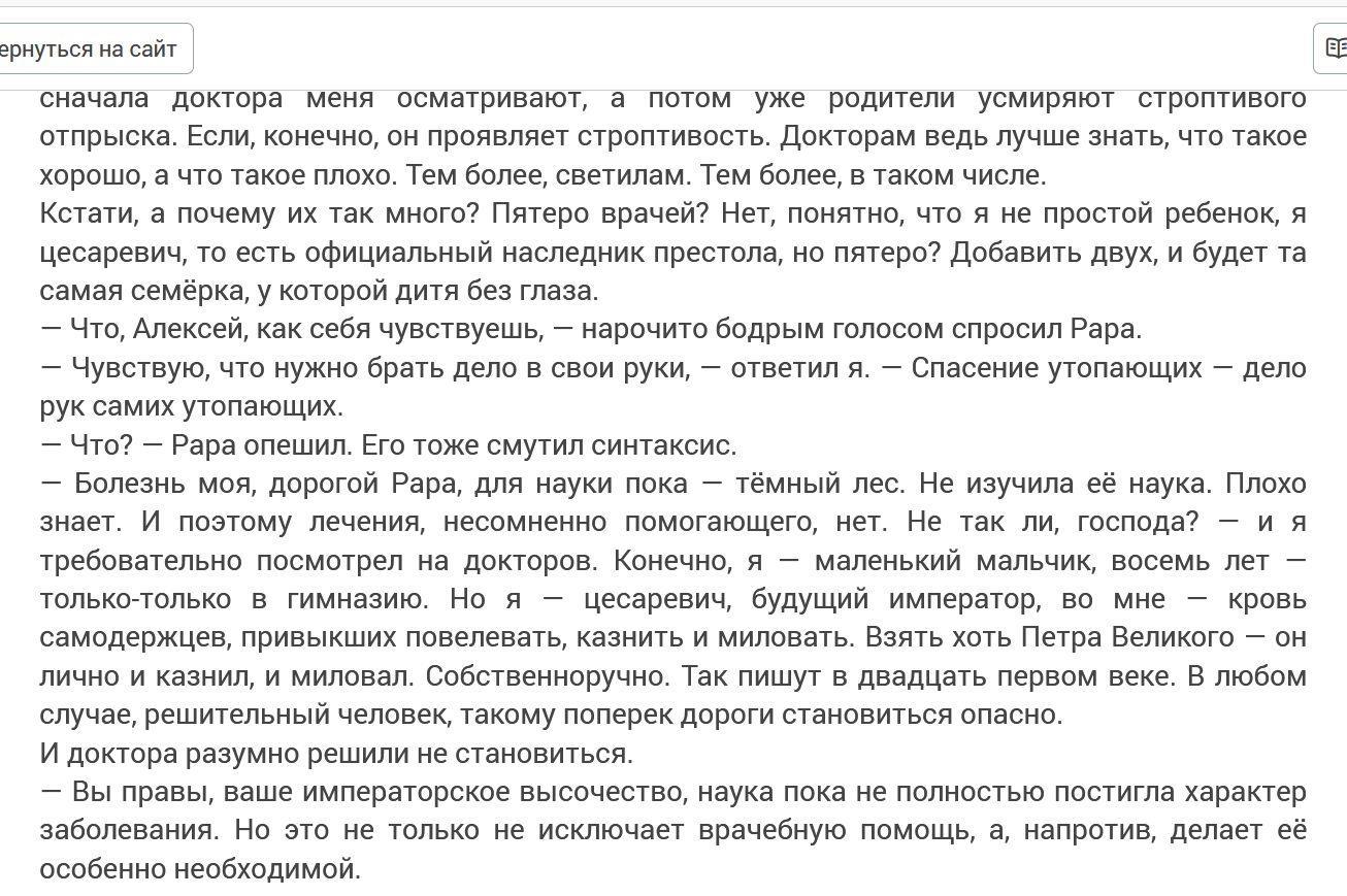 Что любопытно, Попаданец в хилого царевича, страдающего гемофили́ей (редкое наследственное заболевание, связанное с нарушением коагуляции (процессом свёртывания крови). При этом заболевании возникают кровоизлияния в суставы...) тоже гемофил. И возраста весьма нежного, что ставит лишние препоны в спасении семьи (а возможно и России). Вот какую высокую задачу ставит автор перед своим героем. А что может быть интересней для истинного читателя, чем борьбы интеллекта с собственной немощью и косностью окружающих!