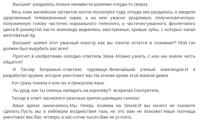Итак, в мире есть мутанты, разных мастей и способностей, при этом, они разделены на различные кланы. Кто-то из этих мутантов смог захватить власть над некоторыми странами, при этом многие страны остались под управлением простых людей. Мутанты стремятся захватить власть над всем миром, но при этом, им мешают сами люди и другие кланы. И вот сама книга начинается с того, что представительница одного из кланов, который правит местной Англией, едет в местную Россию, чтобы захватить в ней власть. Для этого, ей нужно поговорить с президентом России, а тот после разговора, должен моментально передать всю власть в стране.