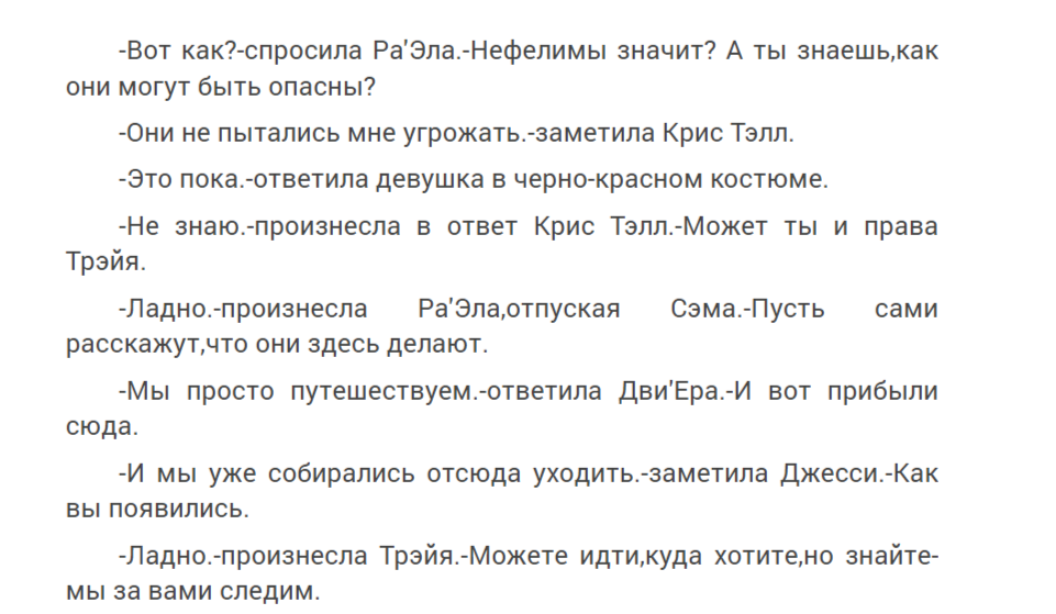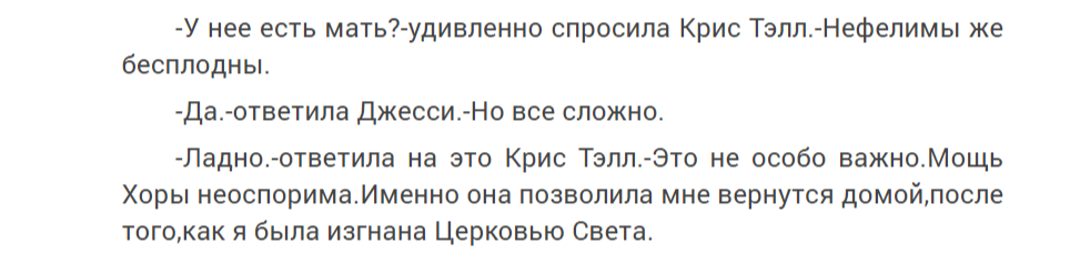 Тоже, к слову, касается и диалогов. Они, как правило, информативны, но часто очень однобоки и не раскрывают личности персонажей, в их речи очень мало каких-либо отличительных черт и даже какой-то ремарки на разницу в голосе. Лично мне не хватило в них глубины, уж слишком легко герои со всем соглашаются и отступают, если что-то пошло не так, из-за чего увидеть в тексте эмоциональную сцену, психологически достоверную, лично мне не удалось.