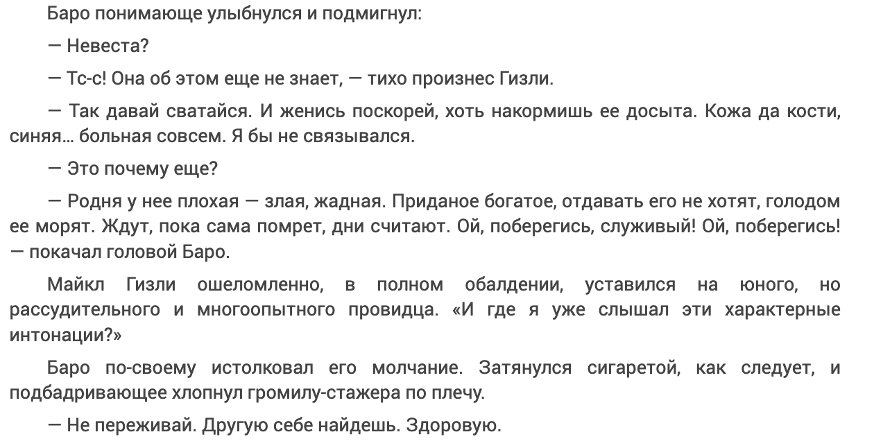 Автор не обещает нам экшена и держит слово, но роман всё равно не даёт от себя оторваться, затягивая читателя, как несчастных жертв своего чревоугодия, в расставленную ловушку. Когда переплетается добротный, мастерски выписанный сюжет и сверхтактильный язык, другого и не ждёшь. Хотя мне показалось, что линия с таинственным угонщиком немного проигрывала остальным, и оставила несколько вопросов.