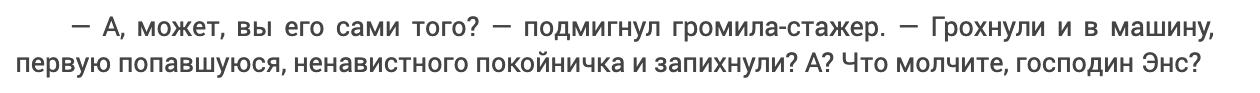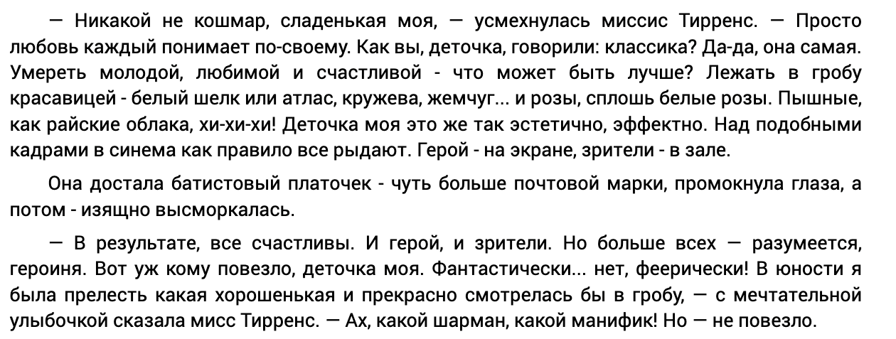 Первое, на что обращаешь внимание при чтении романа, — язык. Очень плотный, концентрированный, работающий на все пять чувств, но при этом не перегружающий. Описания и диалоги буквально впихивают тебя что в "фарфоровый домик" с его кремовыми реками и зефирными берегами, что в полицейское управление, где всё по делу, однако есть место и реликвии, что на стоянку для люксовых авто, переживающую не лучшие дни. Язык настойчиво, но деликатно подчёркивает разницу в манере общения "сладкой бабушки" миссис Тирренс: