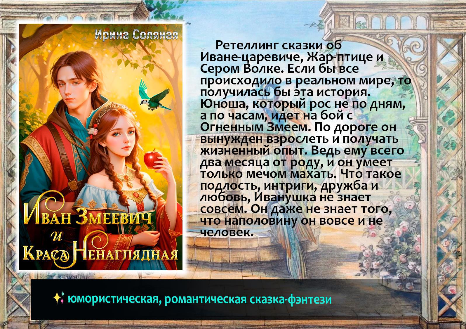 История об Иване Змеевиче и Красе Ненаглядной не единственное произведение автора, с которым знаком. Ирину Соляную ценю высоко. Владеет она как словом, так и стилем. И пуще того – умеет некий нерв человеческий найти и зацепить. Но к данному произведению отношение сложилось неоднозначное. Поэтому читателям советую познакомиться с этой сказкой. Свои восторги и сомнения я изложу, но собственное мнение всегда лучше. Произведение небольшое, бесплатное, интересное.