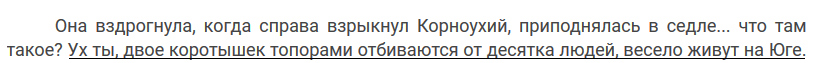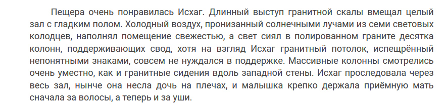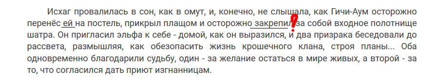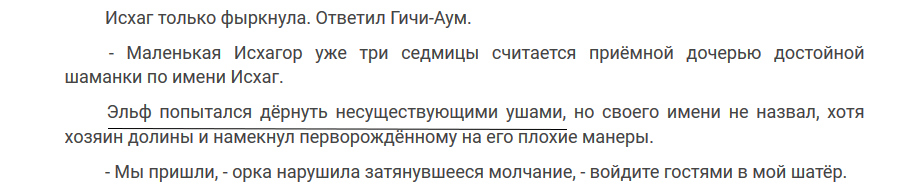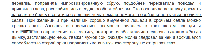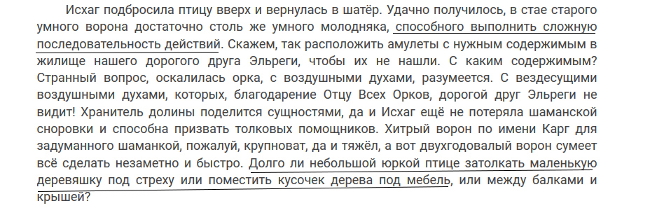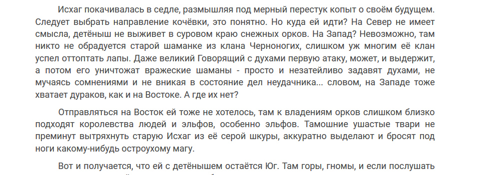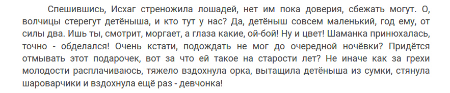 И таких примеров "всплывания" деталей в "нужное" время в книге хватает. Сейчас навскидку - про особую орочью посадку в седле. Несколько глав Исхаг едет верхом, а потом вдруг в четвертой главе узнаем, что существует особый способ расслабляться в седле. А до этого она на протяжении нескольких дней не расслаблялась?