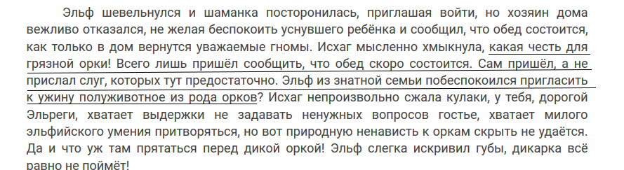То общается с хозяином вполне мирно, он ей всяческое уважение демонстрирует, а потом вдруг начинает думать, ишь, сам пришел звать, не слишком ли большая честь для грязной орки? Странно.