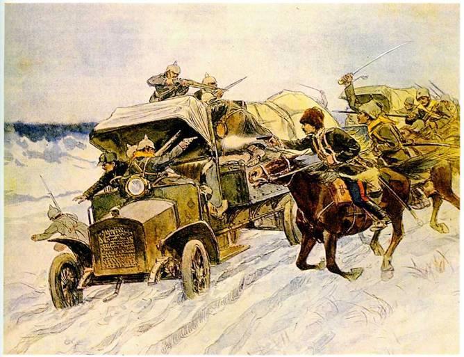 Использую данные кадры и картину И. Владимирова. «Захват германских автомобилей» (картина времён Первой мировой войны), дабы проиллюстрировать наподобие чего (приближенно) будет техника в книге. Там она более примитивная, но внешне все равно думаю доведена, судя по описаниям, до подобного внешнего вида.