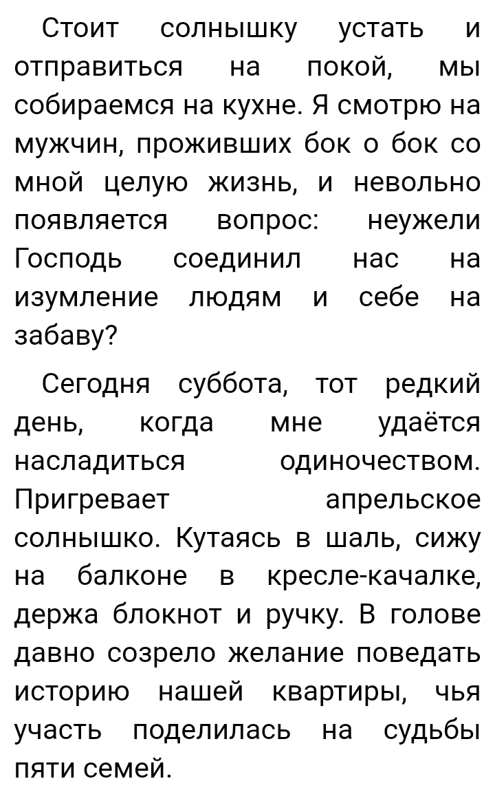 Как вы понимаете, дальше будет рассказ от лица главной героини. О себе и своих четырёх мужьях. Об общем военном детстве. О любви и привязанности. Об ошибках и изменах... В общем, о жизни в целом и о странных причудах судьбы, в частности.