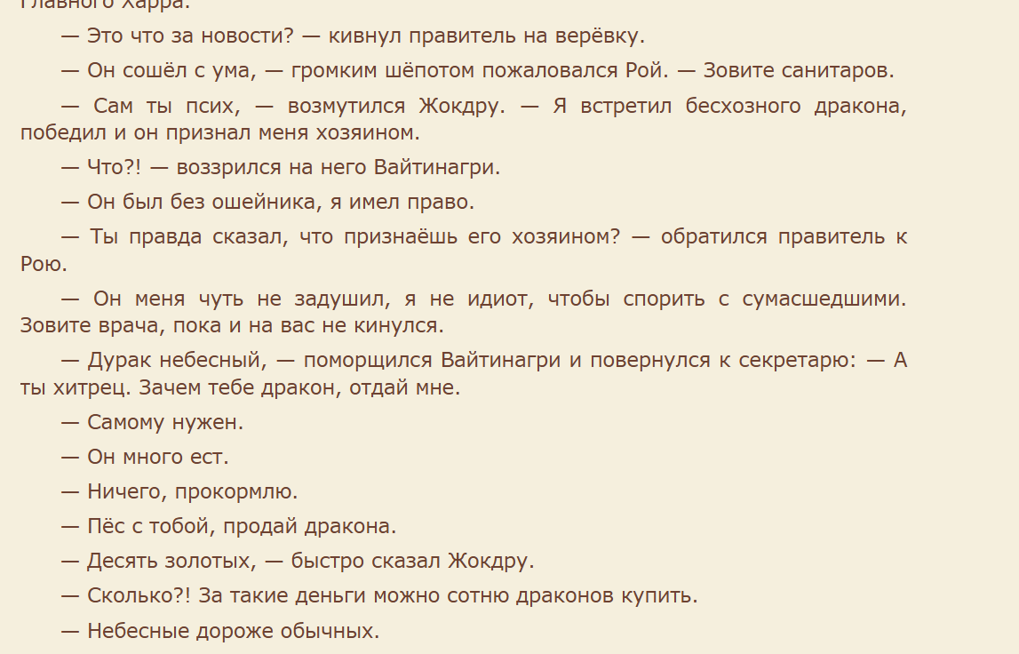 А на этой самой Дзете есть легенда о том, что однажды с неба слетит Небесный дракон и покарает всех виновных, а всем праведникам надаёт плюшек. И есть даже секта... И вот как раз жрец этой секты берёт Роя в оборот, уговаривает пойти и покарать правителя. Рой карать не хочет, он пацифист, он против смерти и насилия... И вся книга о том, как общество, весь мир пытается сделать из Роя настоящего дракона. Дракона грозного и карающего, страшного и ужасного. Разумеется, карающего не их, а того, кто их обидел. Потому что каждый харр уверен: сосед-то хуже.