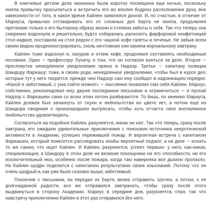 В плане орфографии и пунктуации текст хорошо вычитан. Очепяток также не обнаружено. А вот повторы одних и тех же слов встречаются с регулярной периодичностью, особенно ближе к финалу, но общей картины от грамотности текста они не портят.