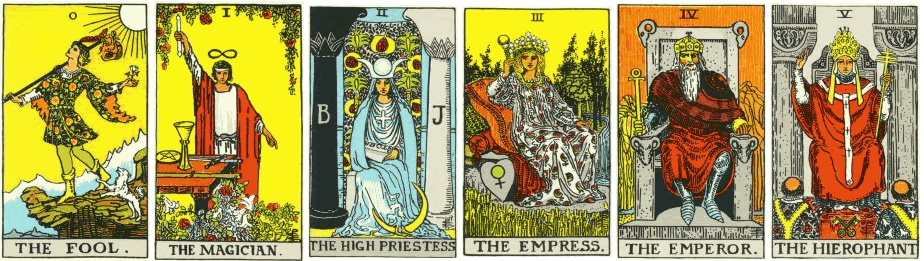 Далее мы узнаём, что, когда король решил воссоединиться с королевой, он прислушался к Минерве-наставнице (Иерофант, 5), поколебался (Влюблённые, 6), и всё-таки ступил на путь (Колесница, 7)...