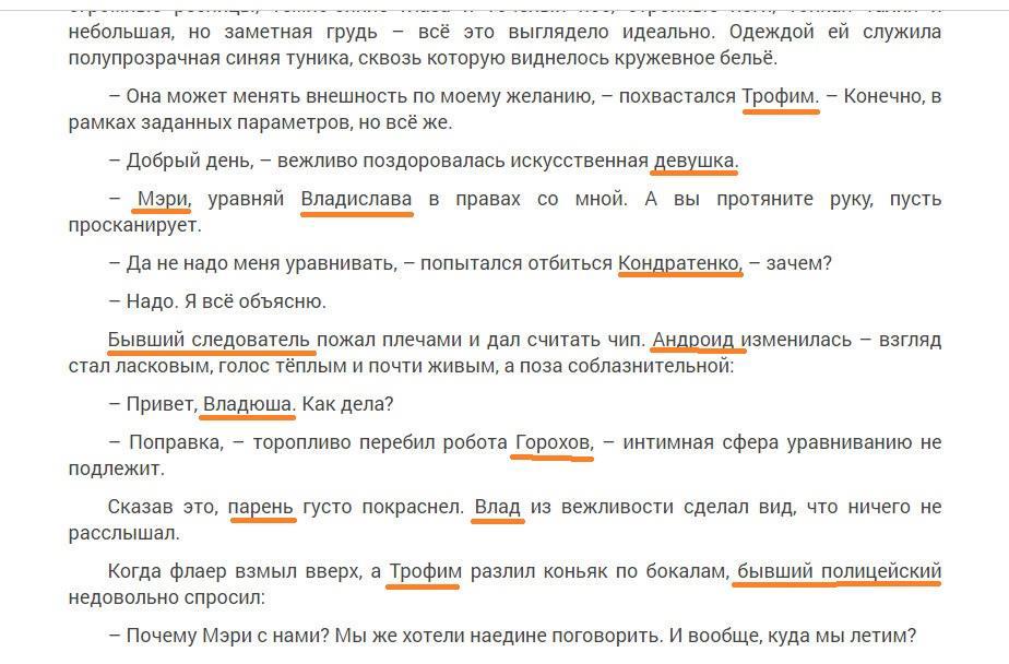 Текст умело нашинкован, грамотно скомпонован и двигается в хорошем темпе. В каждой главе что-то важное и очень вовремя происходит, прекрасно раскрывается тайна и накручивается интрига. И — ура! — это очень шустрый детектив. Загадочным образом погибают в реале люди, находящиеся в виртуале и даже будучи в этом реале совершенно одни.