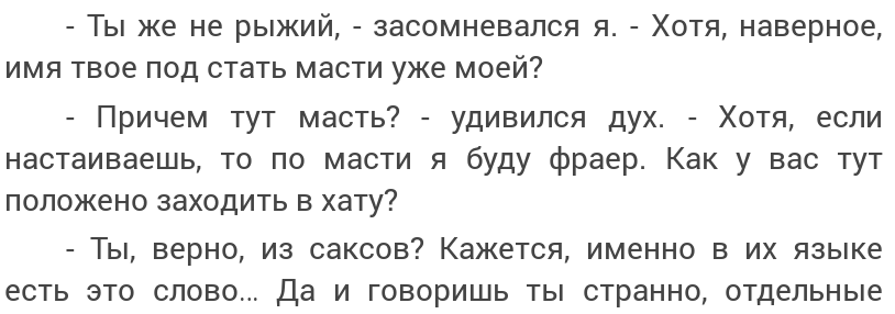 2. Ехидный внутренний голос. (На деле, дух-хранитель.) Уж и не знаю, специально ли сконструировано так, что ГГ является "рыжим" (в данном случае цветом шерсти) и ГГ является скальдом - в сеттинге магом. И тут ехидный внутренний голос... ЕВПОЧЯ.