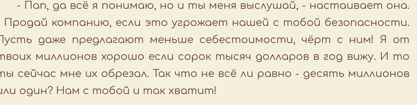 Китаянка вообще уникальная личность. Такое ощущение, что она уверена в своей неуязвимости, хотя, не думаю, что не понимает, насколько изменится её положение, стоит лишь выйти замуж. А может просто это такое отчаяние в предчувствии неизбежного? И, конечно, высшей точкой эгоизма стал её ответ отцу, попавшему в сложную ситуацию: