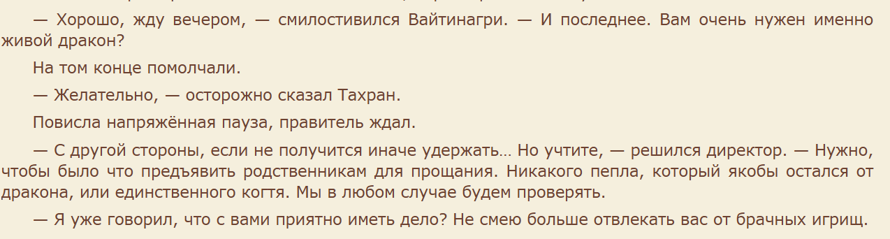 А вот вам вторая могущественная личность, правомочный представитель 3-го отдела. Вы не знаете, что такое 3-й отдел? Поверьте, этого вам и знать не стоит. Чем меньше с ним сталкиваешься, тем легче. В отличие от главного харра Тахран всё же драконианец и старается обойтись без лишней крови, но...