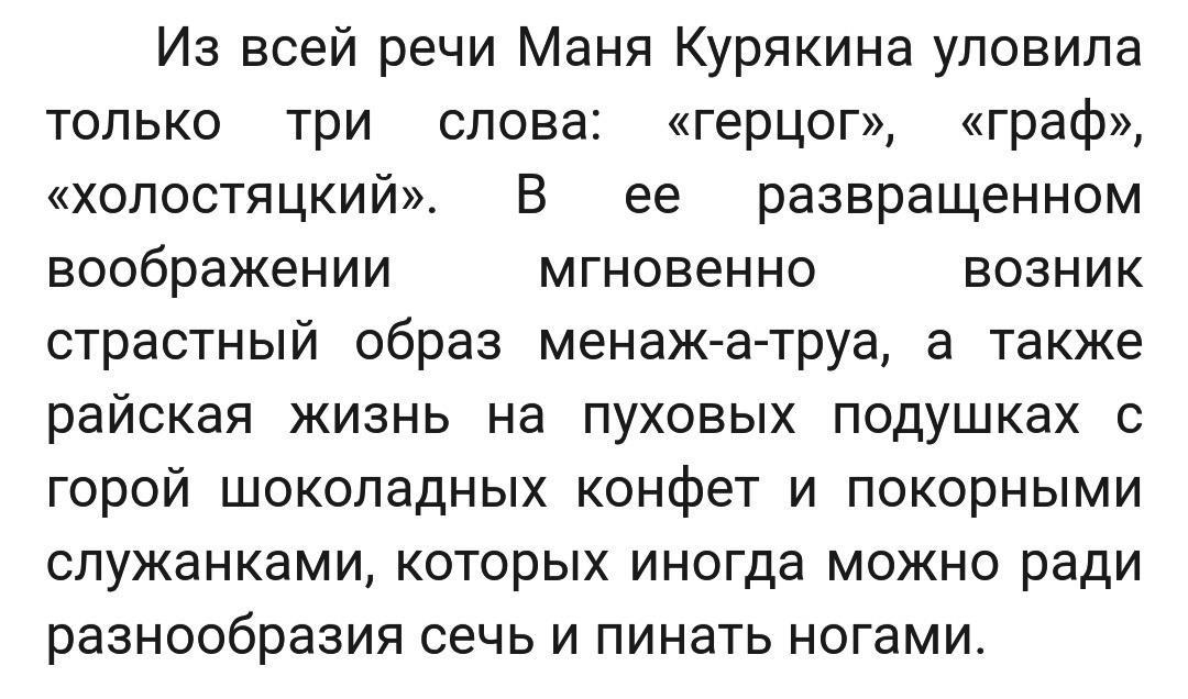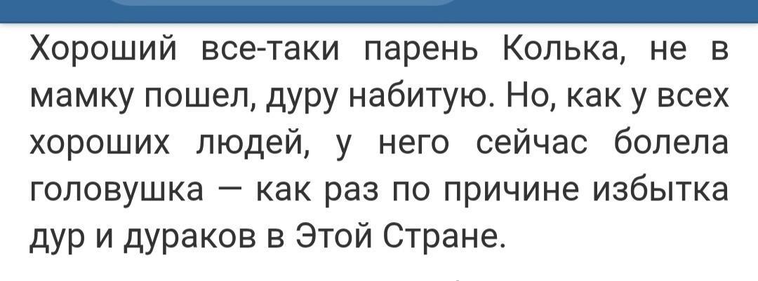 У других есть друзья, которые отдадут жизнь за друга, у них светятся глаза, у них все хорошо, и даже в дождь и слякоть у них хорошее отношение. Они летают в космос, строят новые дороги и города, пишут умные добрые книги и радуются, что живут в такой стране, где могут реализовать себя без герцогов и испанцев. Среди вашего окружения нет таких людей? Тогда, осмелюсь предложить, вам, может быть, надо сменить окружение? К псам собачьим актеров-неудачников, криворуких электриков и Мань Курякиных из Фердипердыщеска!